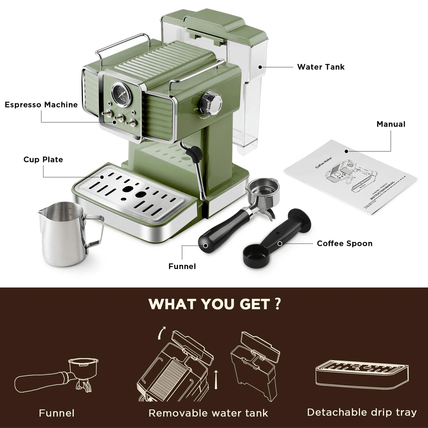 ALL KINDS OF COFFEE - Brew a cup of espresso, cappuccino, or latte and so on at home with this vintage espresso coffee machine just like a barista. 15 bar professional pressure extracts quality cups of coffee, providing you multiple options to creat your favourite coffee drinks according to your personal taste preferences.