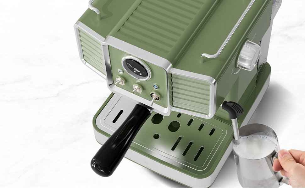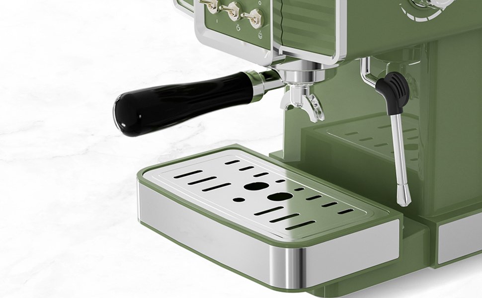 ATTRACTIVE DESIGN - Unique retro European Industrial style. This espresso coffee machine comes with a stainless steel handle which has double outlets. Durable and strongly heat-resistant.