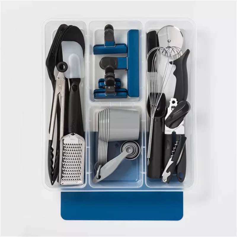 Includes measuring spoons, pizza cutter, spatula, whisk, measuring cups, 3 spoons, tongs, slotted spoon, wine bottle opener and more