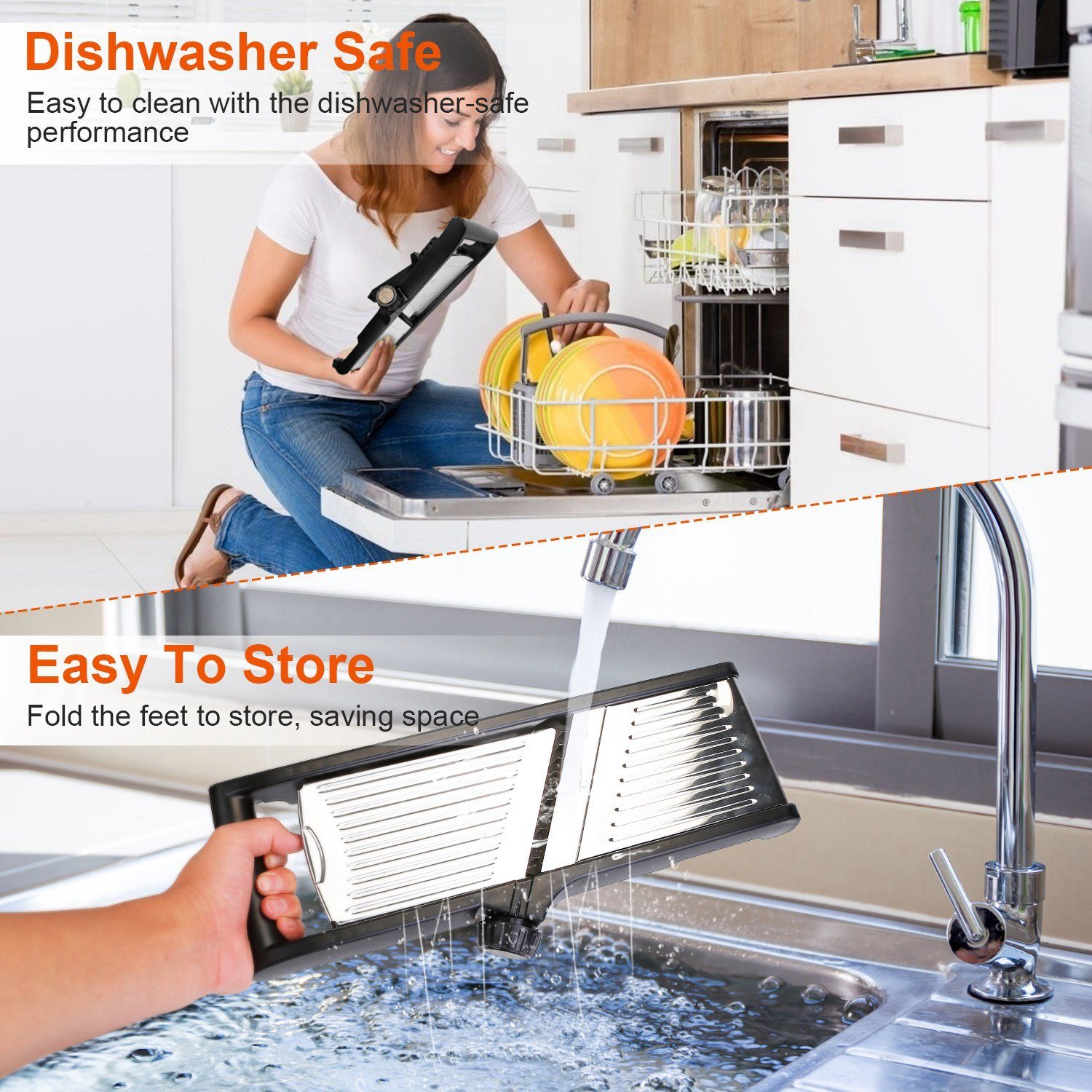*Space Saving Food Slicer*:The blades are built-in and do not take up extra space. The non-slip feet can be folded for easy storage in a drawer; saving space.