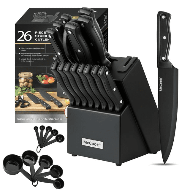 Made of high-carbon one-piece stainless steel with super black coated all over, the mccook 26-piece black knives sets are dishwasher safe, non-stick and rust-resistant.