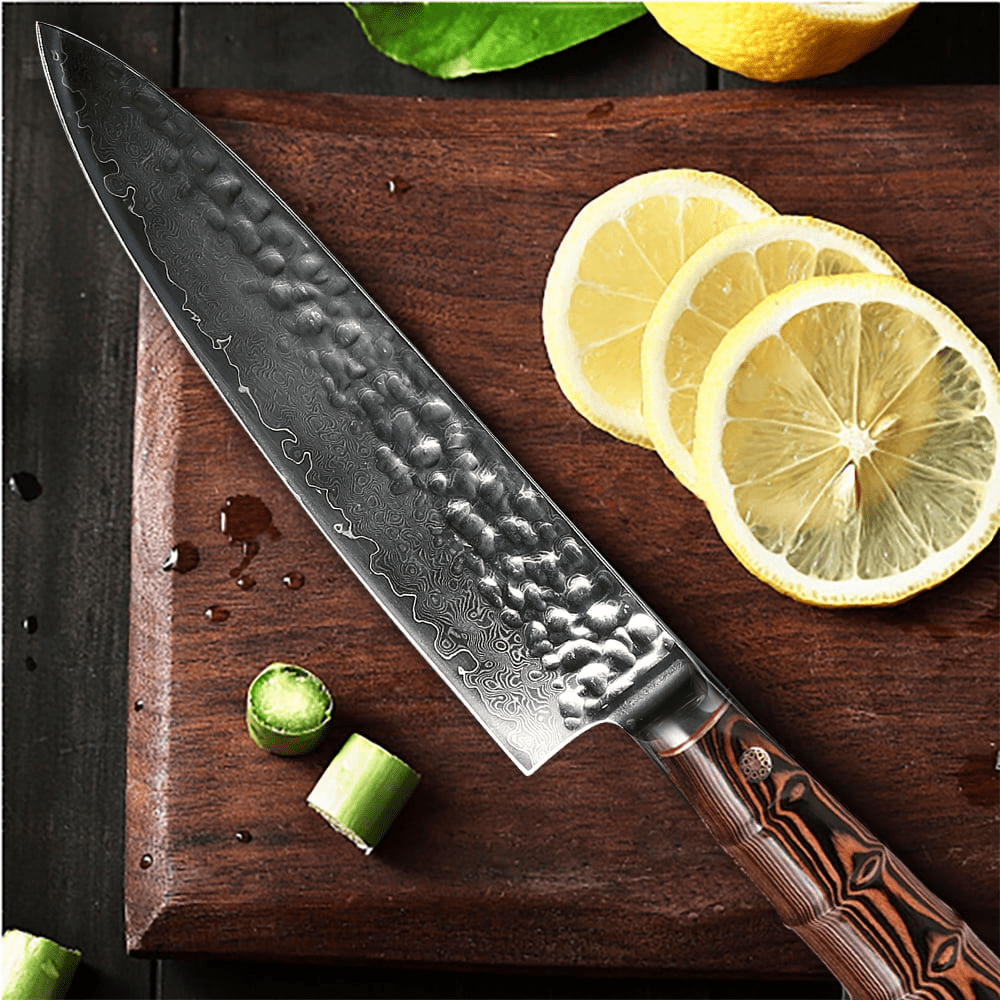 Thanks to handmade many times forging by traditional craftsmen,damascus chef knife forming beautiful hammered pattern on the silver blade,it could prevent food adhesion effectively,lock in food juices to keep food original nutrition.This chef's knifes has always been favored by top home chefs and professionals.