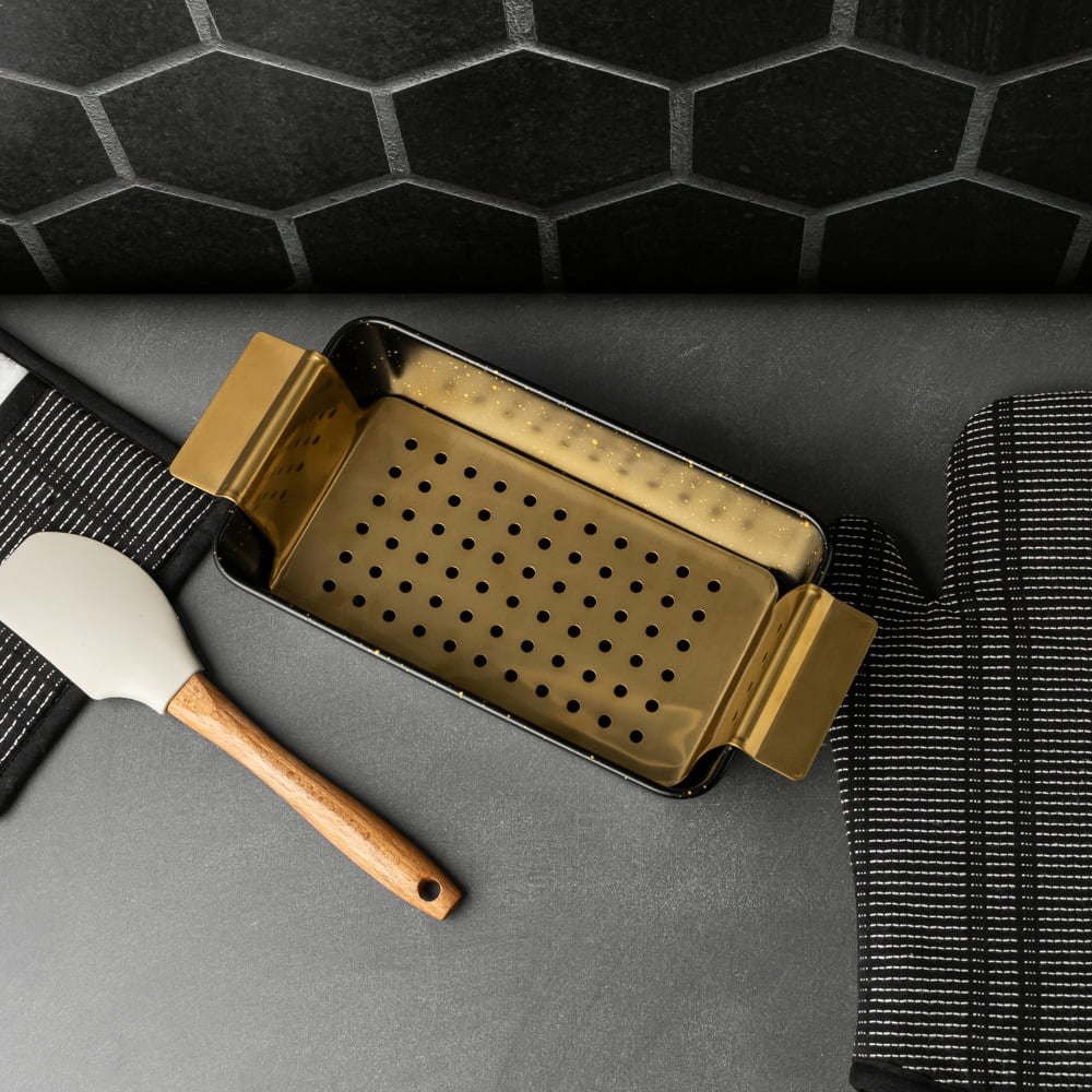 Introducing the Thyme & Table Non-Stick Loaf Pan with Gold Stainless Steel Trivet, your perfect companion for all baking adventures. Ideal for both baking and serving, this set combines style and functionality to elevate your kitchen experience.