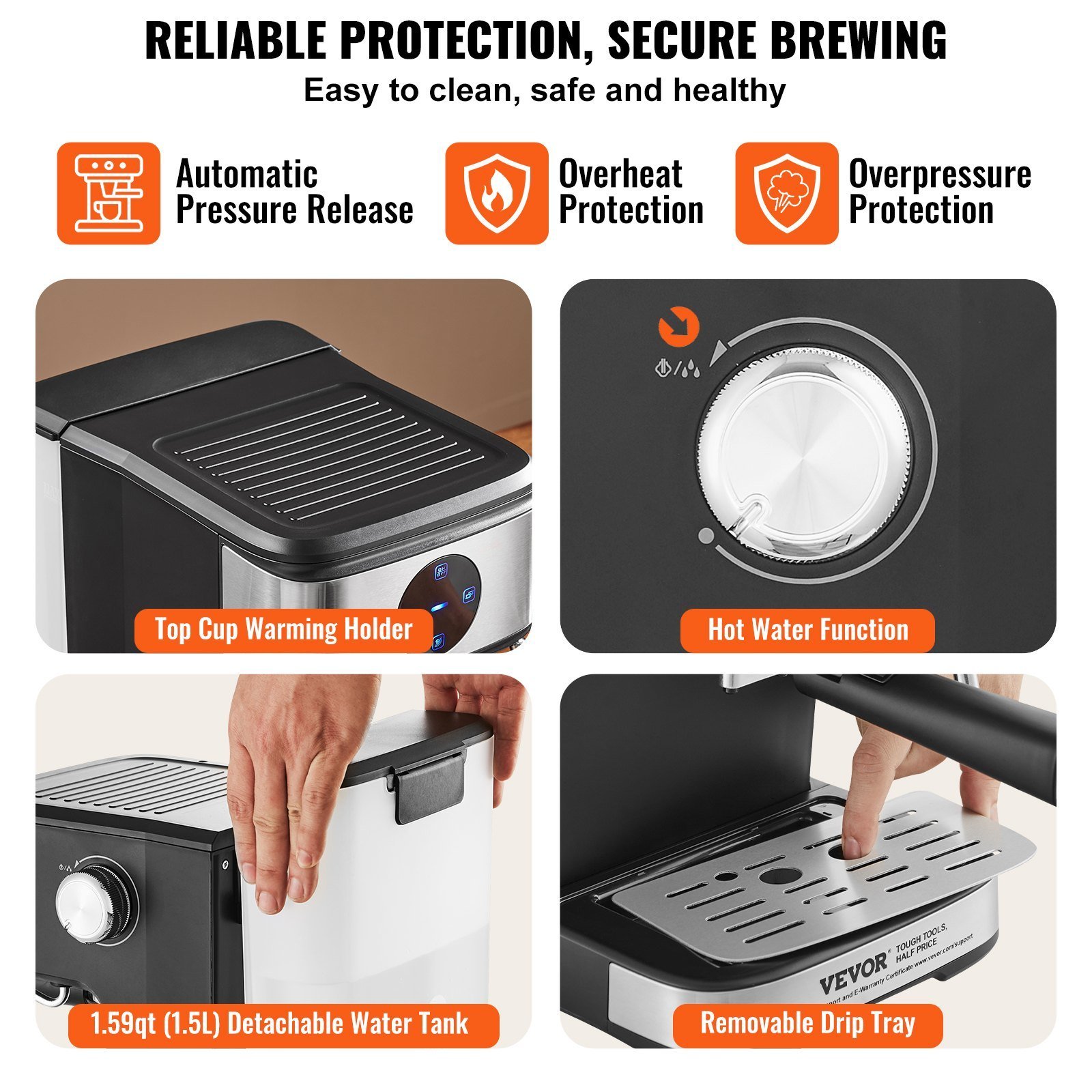Experience coffee perfection with VEVOR espresso machine. With professional 15-bar pressure system, professional low-pressure pre-soaking technology, rapid preheating, 1/2 cup adjustable volume, NPT temperature control, and soft touch screen, ensuring top-notch coffee quality every time.